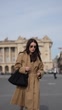 PARIS, FRANCE - OCTOBER 1: ( SLOW-MO ) Annabel Rosendahl wears long straight dark brown hair with a center part, round gold-framed sunglasses with dark lenses, small stud earrings, a black leather hobo bag, a black top layered under a camel cotton wrap trench coat with a wide draped collar, oversized long sleeves and a belted waist, outside Dior, during Paris Fashion Week - Womenswear Spring Summer 2026, on October 01, 2025 in Paris, France (Footage by Edward Berthelot/Getty Images)