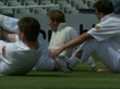 Atherton prepares for test; ENGLAND YorkshireHeadingley CMS Michael Atherton (England cricket captain) holds ball in training PAN R-LGV Cricket ground as players run in packCMS Atherton and colleagues sit on grass as exerciseCMS Pads of batsman as plays shotLABV Bowler away as bowlsMS Atherton plays shot in netsCMS Philip Tufnell (England) bowls PAN R-LMS Atherton with bat in netsCMS Ray Illingworth (Chairman of Selectors) intvwd SOT - We want everyone to forget about last week/ Atherton is a nice honest lad/ He's out best captainMS towards as carries pads and helmut PAN L-RLAMS Covers go over wicketCMS Atherton's feet as stands with bat TILT UP to face