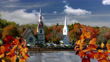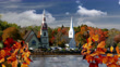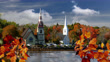 Autumn leaves embrace the three churches in Mahone Bay, Nova Scotia
