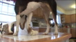A Basenji roams on a table top and sniffs around.