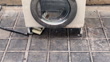 High angle close-up tilt up shot of a broken washing machine abandoned in the street