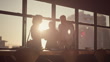 Business people, morning and handshake for meeting, partnership or b2b deal in agreement at the office. Group of employee shaking hands in sunrise for greeting, teamwork or collaboration at workplace