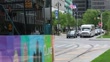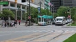 A car from the Q-Line, a newly opened light-rail travels along Woodward Avenue in Detroit, MI, USA on June 23, 2017. Shots: Wide shot of Qline Detroit tram passing by frame wide shot of same tram moving away from camera shot of people waiting for tram as it approaches camera