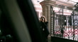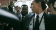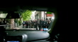 View from inside vehicle as it approaches entrance, cheering fans at barricade, security staff separating crush of photographers from celebrity about to emerge.