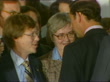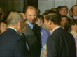Crowd waiting behind barrier ropes / Prince Charles, Prince of Wales arriving with others, meeting people, and meeting crowd / Charles and others away up staircase / men waiting in office / placeholder on table for 'His Royal Highness The Prince of Wales' / Charles meeting men including Clark Clifford (Former White House Counsel) and Don Edwards (Congressman) / Charles signing book