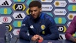 GLASGOW, SCOTLAND - OCTOBER 14: Che Adams, Scotland striker, talks about how to pull up after suffering four-defeats in a row suffering late goals during a press conference ahead of their UEFA Nations League clash against Portugal at Hampden Park on October 14, 2024 in Glasgow, Scotland. (Footage by Niche Sport Media via Getty Images)
