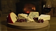 Stock HD Video clip footage of a Cheeseboard platter on the table at with a fire burning behind - Slow zoom in