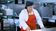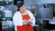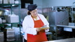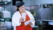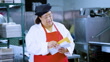 A senior black woman standing in a restaurant kitchen in her red apron, writing on a clipboard and looking through a stack of envelopes. The small business owner is shaking her head, looking at the bills to be paid.