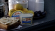 CLOSE ANGLE OF HUMMUS, PITA BREAD, GRAPEFRUIT AND PLUMS OR FRUIT ON COUNTERTOP NEAR COFFEE POT, SUGAR PACKETS AND STYROFOAM CUPS. COULD BE OFFICE BREAK AREA. FOOD.