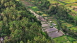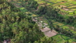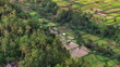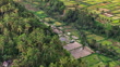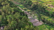 Close up Aerial Drone Sunset Scene of Paddy Fields terrace in foreground, Bali, Indonesia.