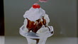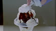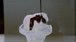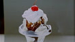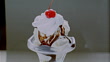 Close up chocolate sauce being drizzled on dish of ice cream / whipped cream being sprayed on top / topped with cherry - Vídeo de stock HD