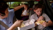 Close up man handing tray of fast food to children in car / boys handing out food - Vídeo de stock HD