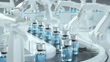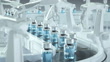 Digital generated image of COVID-19 vaccine bottles moving along robotic production line.