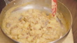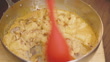 close view of Stirring creamy chorizo mushroom gnocchi in a frying pan