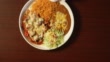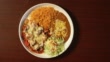 Directly Overhead Shot of a Person Placing a Plate of Bacon Wrapped Shrimp with Mexican Beans and Rice on a Table