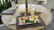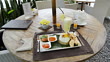 MS Dish of Nasi Goreng with fried rice, chicken, egg, kerupuk crackers, pineapple juice and balinese food at Asia / Ubud, Bali, Indonesia - Vídeo de stock HD
