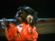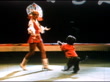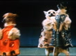 Dogs doing tricks; jumping through hoops, walking on hind legs while dressed in clothing.