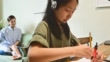 Students who learn by studying at home using a computer. She uses a compass and a protractor to draw shapes.