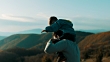 Father carrying son on shoulders at top of the mountain