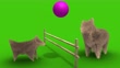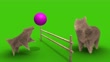 Cheerful dog family playing volleyball with village fence.