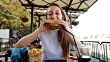 There is one young woman age 22. She is in the outdoor restoraunt and she eat a burger, fries and drink soda. She enjoy it.
