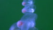Slow motion shot of glowing sea salps swimming in green ocean. close-up underwater sea life