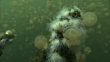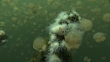 Golden jellyfish (Mastigias) trapped by anemones in lagoon, Palau - Vídeo de stock HD