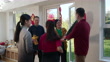 A handheld shot of a woman greeting her family that are visiting her home in Newcastle Upon Tyne, England to celebrate Chinese New Year together. They are embracing together and the home has traditional Chinese New Year decor.