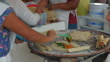 Medium close-up shot real time of female hands of vendors arranging and cooking flautas on hot grill at street taco stand in Oaxaca