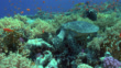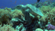 Hawksbill turtle (Eretmochelys imbricata) eats coral from reef as sailfin surgeonfish (Zebrasoma veliferum) feeds on its shell, Red Sea. (FKIB734R - Clip taken from series rushes - 22289)