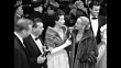 ABC host Dennis James & hostess Maggi McNellis in a mink stole with Faye Emerson wearing a full length fur coat, speaking about people attending , Emerson's husband Skitch Henderson to left, actor Robert Sterling stands to right waiting for ABC to interview his wife Anne Jeffreys, visible just at edge of shot.