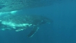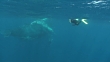 A humpback whale mother and calf swim past the camera then past a snorkeler on the surface.