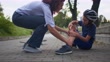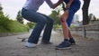 Boy feeling pain after he felt from skateboard and injured knee on street in city. Injury looks deep and serious. One passer by helping him to stand up