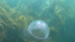 Jellyfish swimming against a kelp forest background in the Lofoten archipelago, Norway