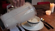 Man serving home made white gazpacho and garnishing the bowls with grapes, toasted almond shavings and olive oil. Ajo blanco is the predecessor of red gazpacho. The dish of Spanish origin is originally made of: almonds, white bread and ice-water and seasoned with olive oil, garlic, sherry vinegar, salt and pepper and served cold with muscat grapes, toasted almond shavings and drips of olive oil.