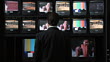MS Man standing in front of TV monitors, watching footage, Dallas, Texas, USA - Vídeo de stock HD