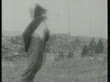 B/W 1915 man wearing top hat stopping on grassy field + dodging bullets fired from offscreen - Vídeo de stock