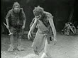 1914 B/W Medium shot Cavemen surrounding cavewoman and dragging her down by her hair - Vídeo de stock