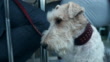 Close up of Wire Fox Terrier at an outdoor cafe in London, England.