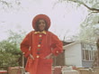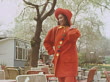 A model dances around some table and chairs wearing a red trouser suit with large decorative buttons designed by Mary Quant. 1972. (Core Number: ANB7930P)