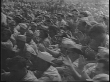 Montage of GI audience, Jack Benny and Carole Landis performing, audience applauding, Benny playing violin.