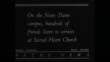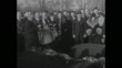 Title card: "Nation mourns Knute Rockne - Famous coach starts last journey from his home in South Bend followed by his wife, children and mother" / pallbearers carrying Knute Rockne's coffin from funeral home through crowd of mourners towards hearse / Rockne's wife Bonnie, sons and mother Martha emerge from funeral home / they walk through crowd / title card: "On the Notre Dame campus, hundreds of friends listen to services at Sacred Heart Church" / shot of administration building with gold dome on top / crowd of mourners in front of administration building / crowd of mourners in front of the Basilica of the Sacred Heart / pallbearers carry coffin out of Church through crowd towards hearse / crowd in front of administration building / title card: "Father O'Donnell conducts final rites at the grave"/ Father Charles O'Donnell, Notre Dame president, throwing holy water on coffin at gravesite, mourners standing around him, then he reads aloud prayer from book / Rockne's mother, wife and sons standing at graveside as prayer is said / O'Donnell reading aloud prayer and again throws holy water on coffin
