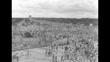 New Indian flag waving / British Governor-General Lord Louis Mountbatten sitting down on throne, his wife Edwina sitting down on throne next to him / members of Assembly in chamber watching / members of assembly standing on stage posing for photo opportunity / Prime Minister Jawaharlal Nehru speaking, Mountbatten and Edwina standing and listening / Nehru speaking, members of assembly listening / soldiers riding on horses through crowd gathered outside, Presidential Palace (Rashtrapati Bhavan) in background / VS busy square / crowd in large open area, artillery piece being fired in salute / crowd rushing forward / soldiers riding horses through crowd / Note: exact day not known