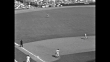 New York Yankees' Yogi Berra hits ball into left field during game 7 of the World Series; Brooklyn Dodgers' outfielder Sandy Amoros runs and catches ball; he throws ball to Pee Wee Reese, who throws to Gil Hodges at first base / WS Yankee Gil McDougald is caught off first base for out / shot of crowd in stands