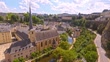 Overlooking the historic Le Chemin de la Corniche in Luxembourg, the viewer is treated to a picturesque vista of old European architecture, with the prominent Église Saint-Jean-du-Grund spire rising above the surrounding buildings under a bright, partly cloudy sky.