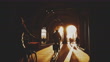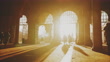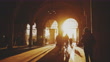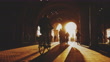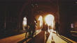 Slow motion shot of silhouette people cycling on bicycle lane leading towards arched entrance streaming sunlight under Rijksmuseum at Amsterdam