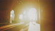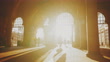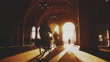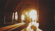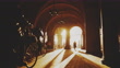 Slow motion shot of silhouette people riding bicycles on street leading towards arched entrance under Rijksmuseum at Amsterdam during sunny day