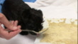 A pet owner feeds an Affenpinscher puppy with a spoon.