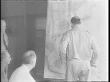 President Franklin D Roosevelt and his War Council (William Leahy, Chester Nimitz, Douglas MacArthur), confer in a room with a map of the Pacific / General MacArthur with pointer points on the map / FDR talking and nodding.