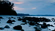 Beach with some rocks in the foreground during the dusk hour in time lapse photography. Location: Punggol, Singapore.